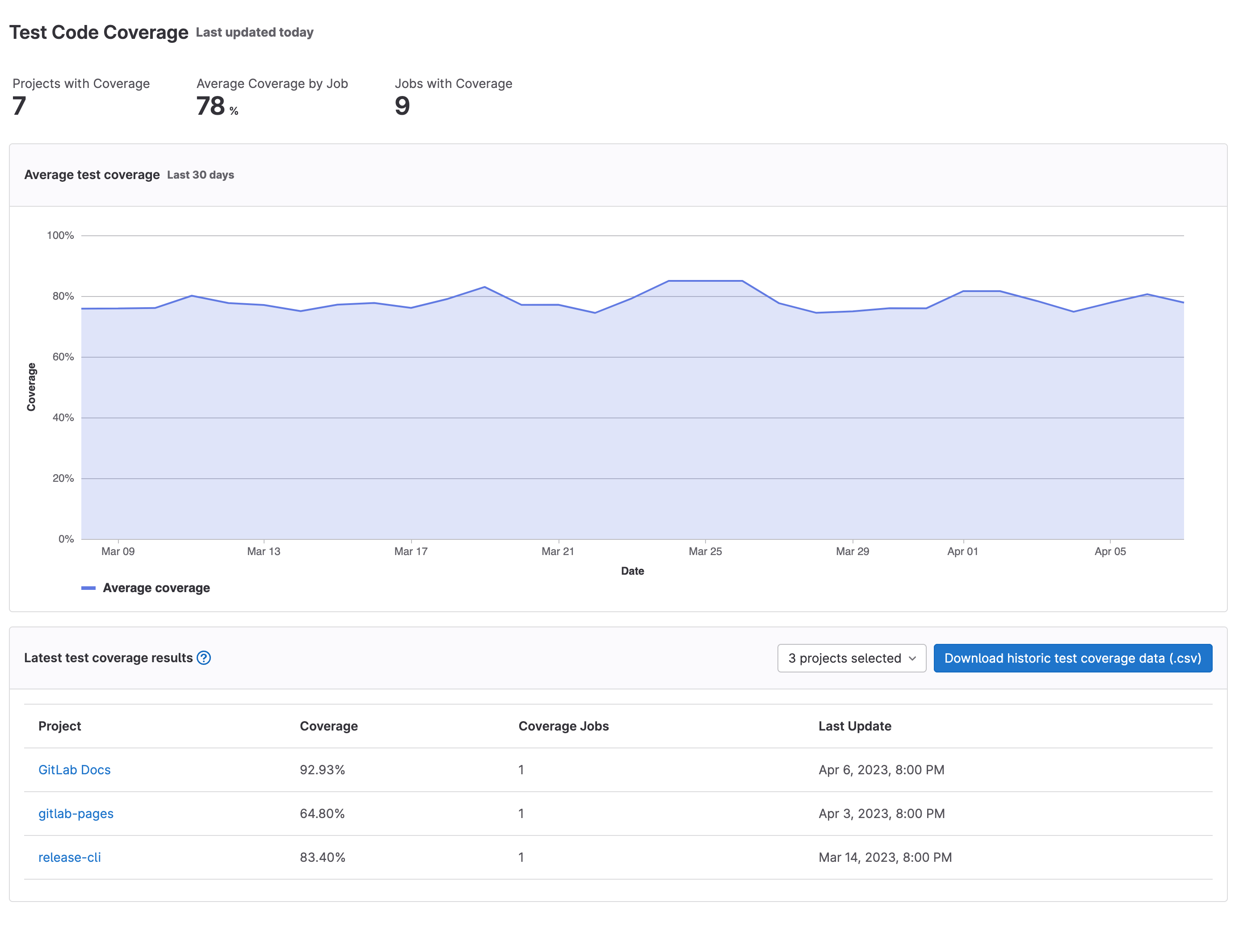 - Optional. To view a CSV file of the data, select Download historic test coverage data (.csv).
