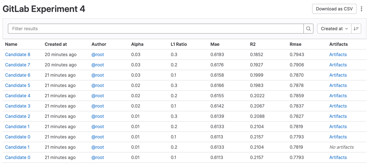 - To display all candidates that have been logged, along with their metrics, parameters, and metadata, select an experiment.
